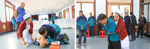 心内科副主任陈雷结合景区员工工作特点,详细讲解了心肺复苏及海姆立克急救法等相关知识,并与心内科护士赵小帅共同进行现场演示互动,使景区员工初步掌握了急救技能操作要领。