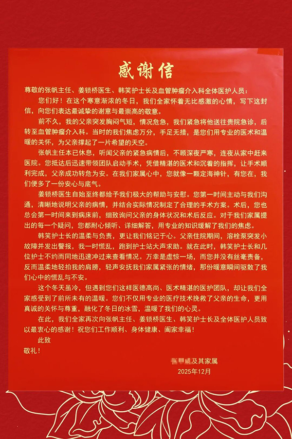 这个冬天虽冷,但张先生全家因遇到血管和肿瘤介入科这支医德高尚、医术精湛的医护团队,却让他们感受到了前所未有的温暖。医护人员不仅用专业技术挽救了患者生命,更用真诚关怀与尊重,融化了冬日冰雪,温暖了患者及家属的心灵。